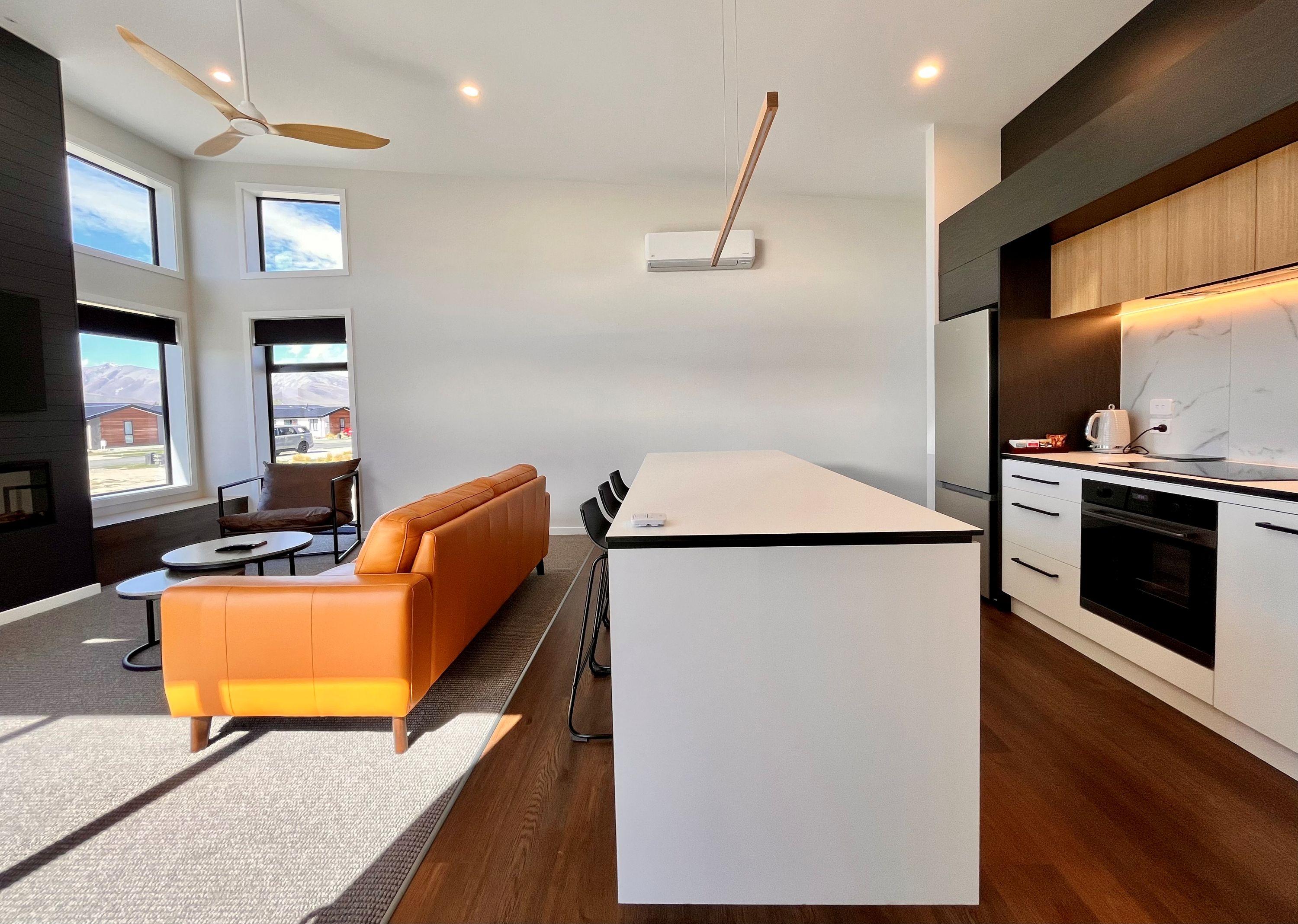 The open-plan living space includes a well-equipped kitchen, ideal for preparing meals or enjoying a relaxed breakfast before exploring Tekapo. Enjoy year-round comfort with air conditioning, a cosy queen bedroom, endless gas hot water and underfloor heating in the bathroom. On cooler evenings, unwind to Netflix with the ease & ambiance of an electric fire.